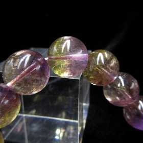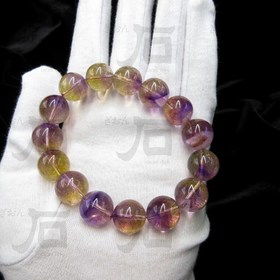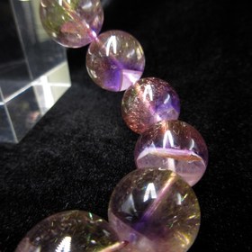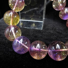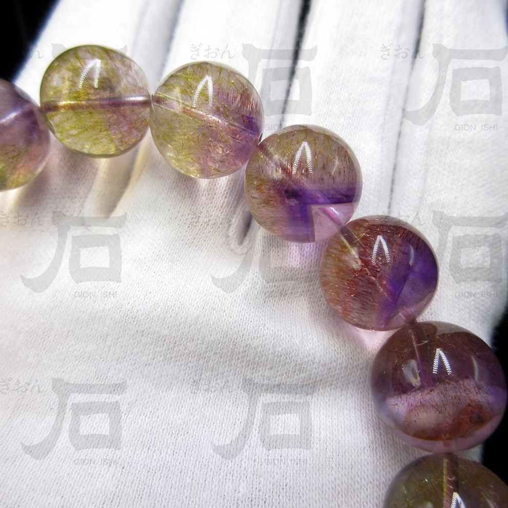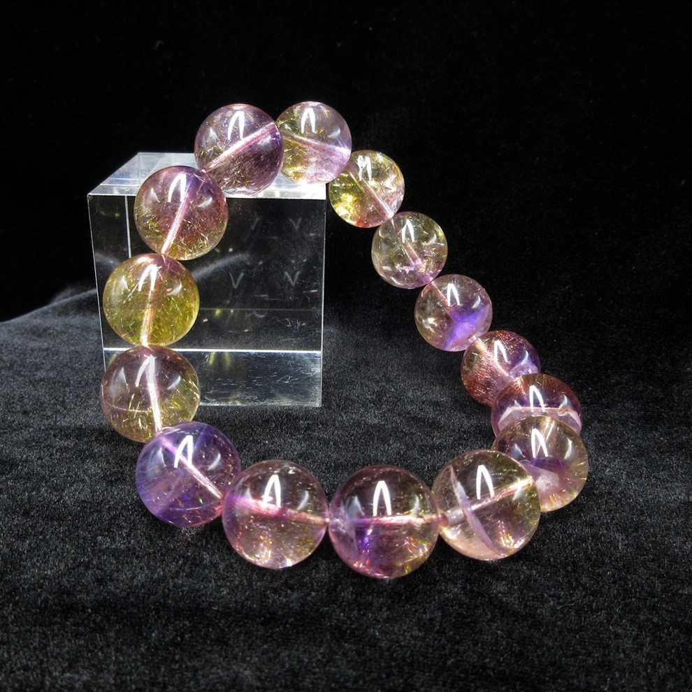 こちらのブレスレットは、水晶の変種である紫色のアメジスト、黄色のシトリン、2つの状態が一つの結晶で確認出来るアメトリンでエレスチャルの現象が起きている原石から作られております。結晶が折り重なり層、山形状になっている部分やレピドクロサイト等の赤い鉱物が含まれていることなど、自然が産み出した神秘的な美しさをそれぞれのビーズから感じ取ることができます。