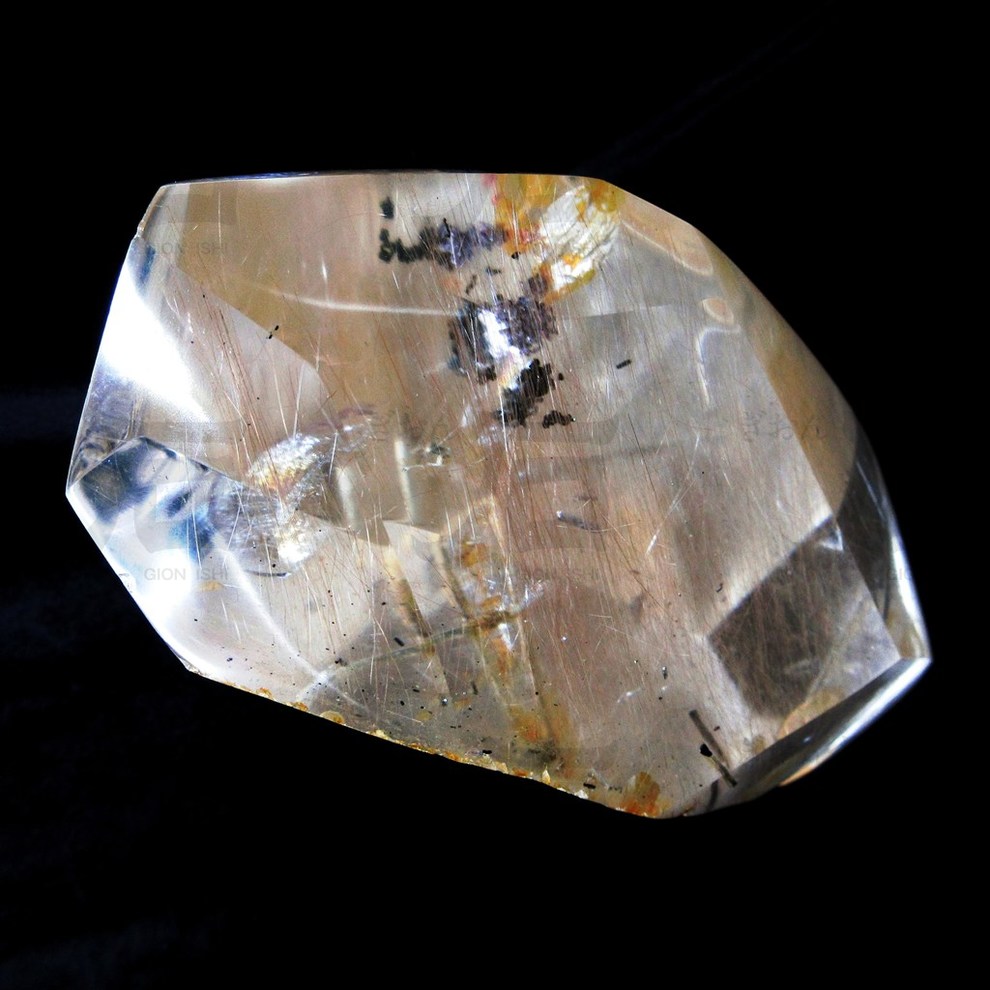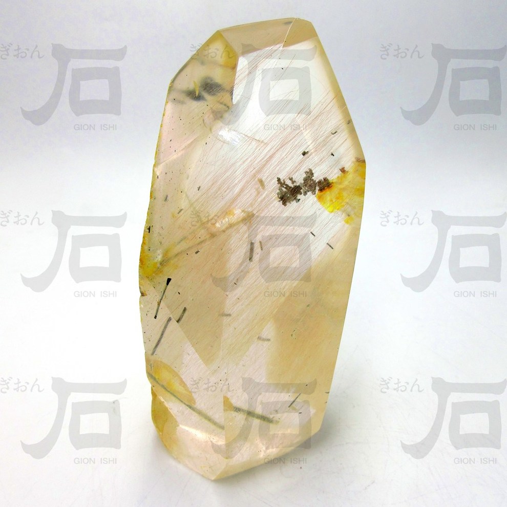 こちらは水晶内部に繊維状のルチルが全体に広がり、所々にトルマリンや別の鉱物も内包されており、見る角度により様々な表情を見せてくれます。