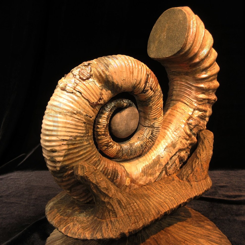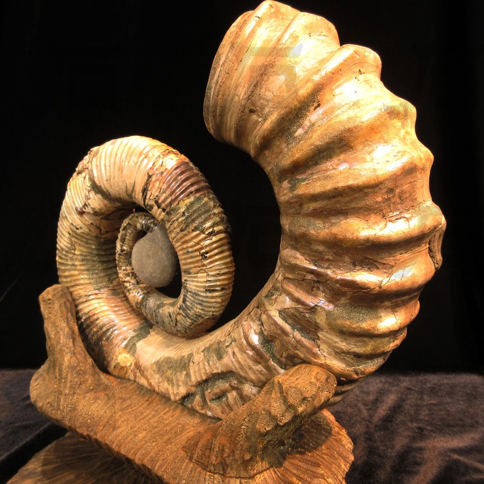 見応えのあるサイズ、ユニークな形状に加えて、化石になる過程で周囲の環境により殻の成分がパイライトに置き換わるという現象が起き、金属のような艶やかな光沢感も持ち合わせた、貴重な一点となっております。