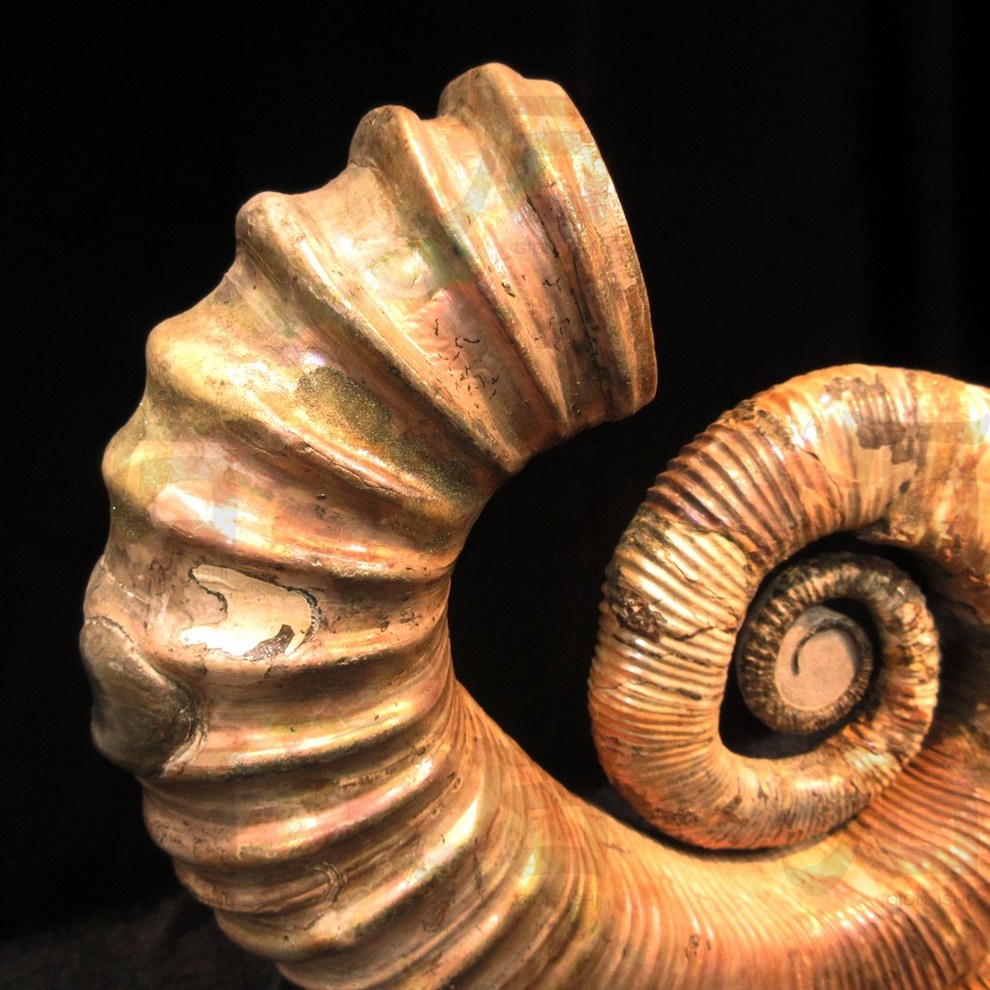 艶やかな光を放つ、解れた螺旋の殻が特徴的な異常巻きアンモナイトの化石です。