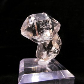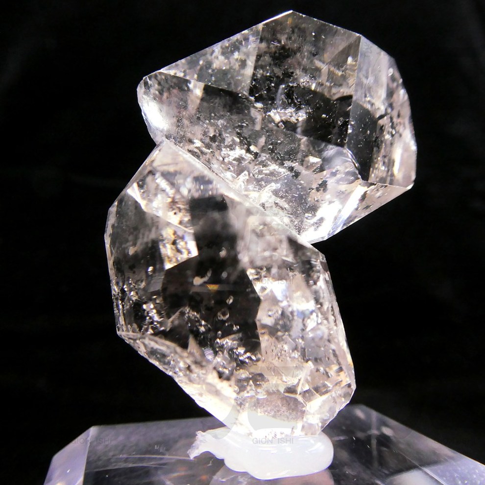 2つの結晶がユニークな形に重なり合う姿がとても可愛らしく、透き通るような結晶内部に黒いグラファイトなどの内包物が含まれ、美しさだけでなく鉱物特有の個性的な面白さも楽しむことができる一品です。